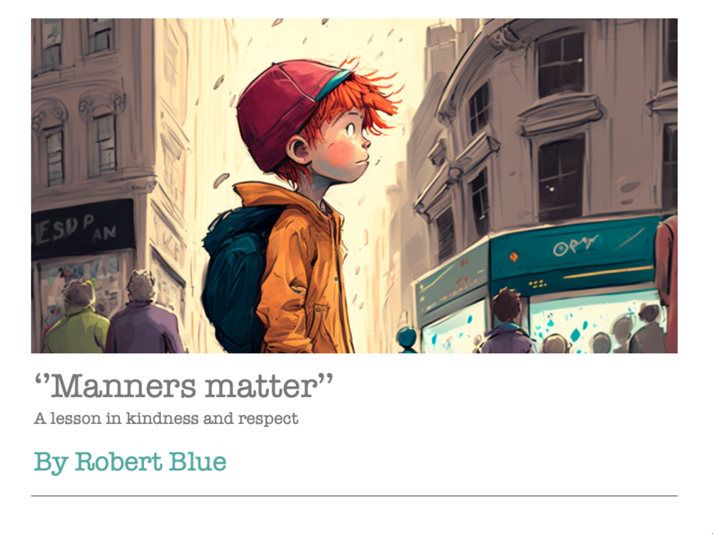 "Join young Jack on his journey as he learns the importance of good manners. From being the new kid in town to struggling to make friends, Jack discovers that manners truly do go a long way. With the help of his kind-hearted teacher, Mr. Smith, Jack learns to be respectful and polite, and in turn, earns the acceptance and friendship of his classmates. But his lessons don't stop there, as he gets the chance to put his newfound manners to the test at a school celebration. Will he rise to the occasion? Follow along to find out in this heartwarming tale of growth and self-improvement."